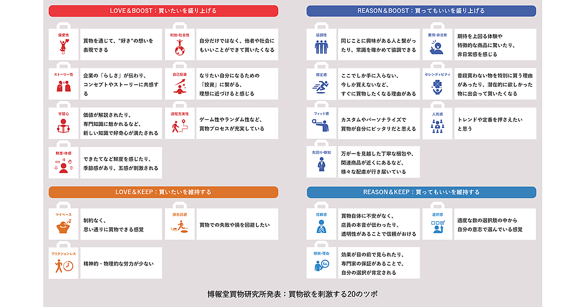 博報堂では、「買物欲を刺激するツボ」について、買う時に感情(LOVE)と理性(REASON)のどちらで商品を選ぶか、買う気持ちを増幅させる(BOOST)か維持させる(KEEP)か、という2つの軸で4つの象限に分類した。
