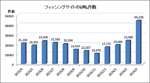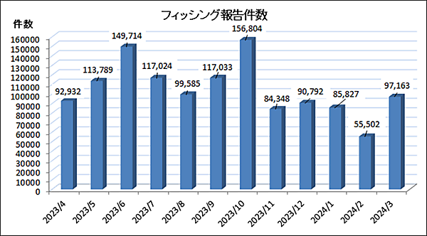 2024年3月のフィッシング報告件数(海外含む)は、前月55,502件より大幅増の97,163件で、再度1万件台に乗りそうな勢いだ。