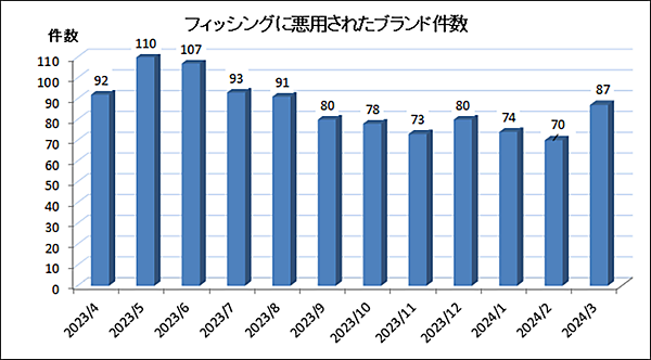2024年3月に悪用されたブランド件数(海外含む)は、87ブランド。内訳はクレジット・信販系15ブランド、金融系15ブランドが並び、通信事業者・メールサービス系9ブランド、オンラインサービス系、EC系、仮想通貨系それぞれ6ブランドだった。ブランドが徐々に入れ替わっている様子がうかがえる。