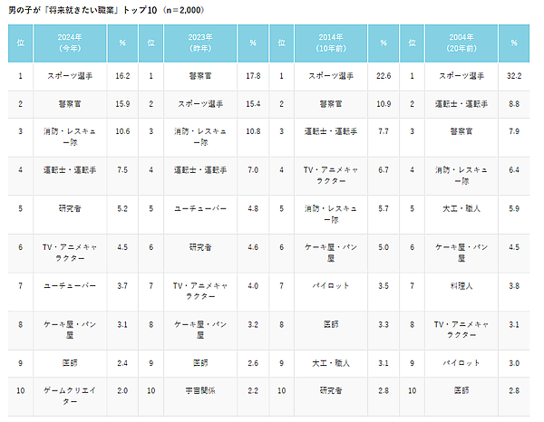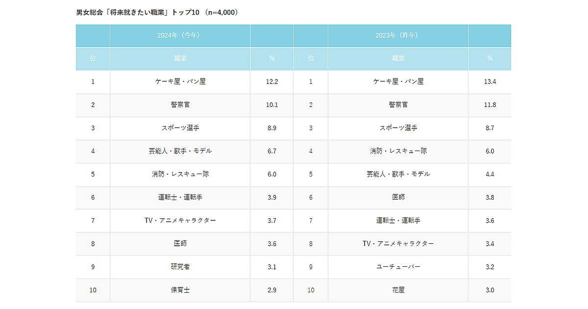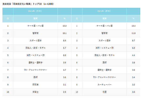 男女を合わせた「将来就きたい職業」では、1位「ケーキ屋・パン屋」、2位「警察官」、3位「スポーツ選手」となり、順位を含め前年と同じだった。トップ10を見ると、これまで人気だったYouTuberが顔を消し(今年は14位)、「研究者」「保育士」が新たにランクインした。YouTuberについては、さまざまなスキャンダルや逮捕報道が増えており、それが影響した可能性が推察される。