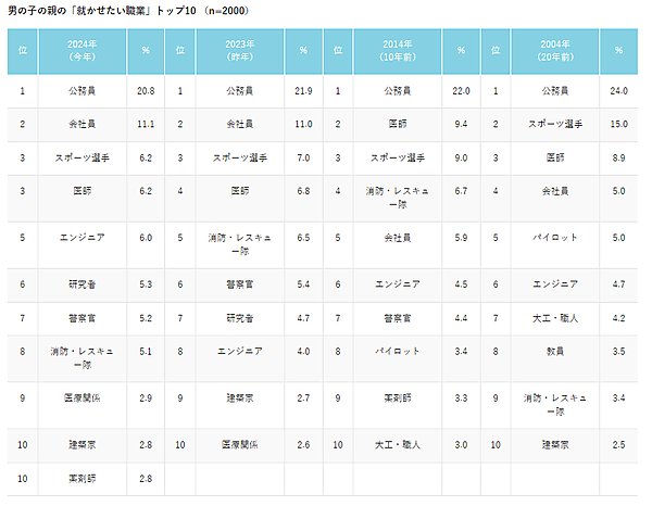 男の子が将来就きたい職業・親が将来就かせたい職業、親は安定志向