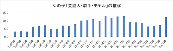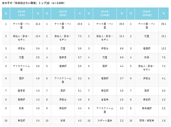 女の子の将来就きたい職業では、調査開始以来26年連続で「ケーキ屋・パン屋」が1位。2位「芸能人・歌手・モデル」はここ数年割合を減らしていたが、今年は前年7.3%から12.4%と大きく数字を取り戻した。それ以外では「保育士」が8位→3位と大きく順位アップしたのが目立つ。