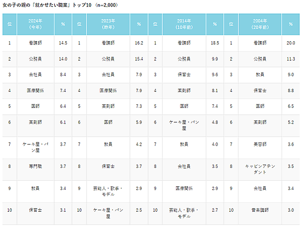 女の子が将来就きたい職業・親が将来就かせたい職業1位は、26年連続ですれ違い