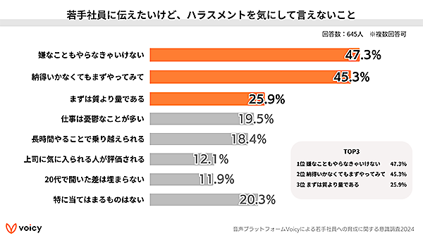 「若手社員に伝えたいけど、ハラスメントを気にして言えないこと」を聞くと、「嫌なこともやらなきゃいけない」47.3%、「納得いかなくてもまずやってみて」45.3%、「まずは質より量である」25.9%が上位だった。