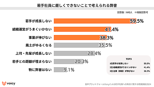 「若手社員に厳しくできないことで考えられる弊害」を聞くと、「若手が成長しない」59.5%、「組織運営がうまくいかない」41.4%、「事業が伸びない」38.3%が上位だった。