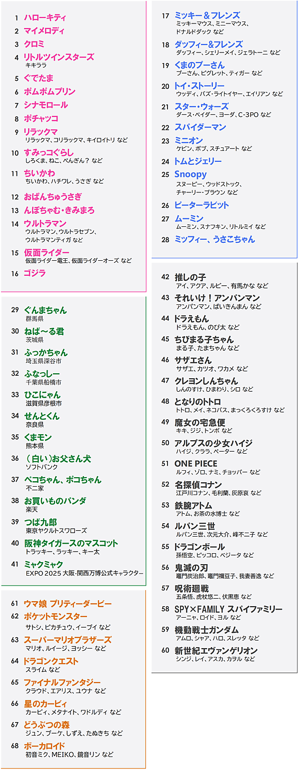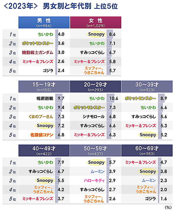 一方年代別で見ると10代「呪術廻戦」、20代・40代「ちいかわ」、30代「ポケットモンスター」、50代「Snoopy」、60代「ミッキー&フレンズ」がそれぞれ1位となっており、日常的にあるいは過去に親しんでいるメディアの影響が垣間見られる。