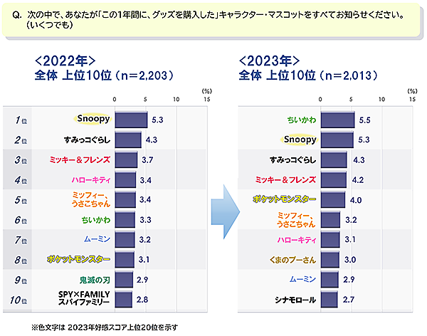 購入率で見ると「Snoopy」「すみっコぐらし」は前年のままだが、「ちいかわ」は前年3.3%から5.5%に増加している。食品から文具、フィギュアやぬいぐるみまで、2023年に関連商品が一気に増加し購入につながったと見られる。