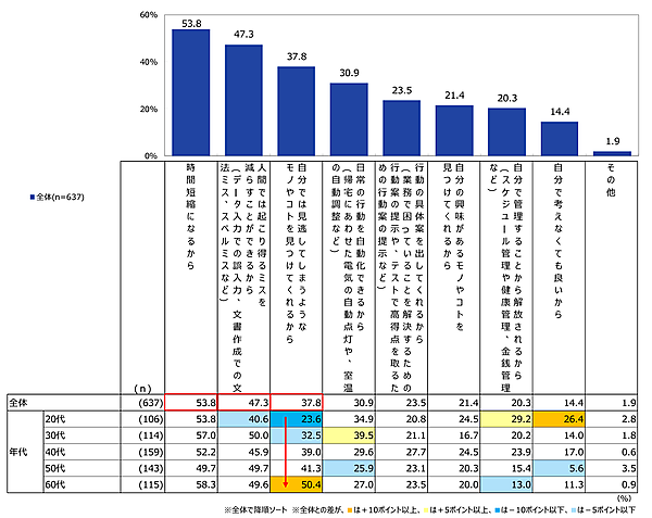 良い印象を持っているとした637人に理由を聞くと、「時間短縮になるから」53.8%がもっとも多く、「人間では起こり得るミスを減らすことができるから(データ入力での誤入力、文書作成での文法ミス、スペルミスなど)」47.3%、「自分では見逃してしまうようなモノやコトを見つけてくれるから」37.8%が続いた。