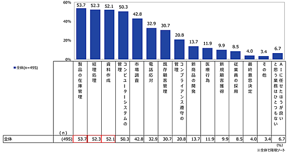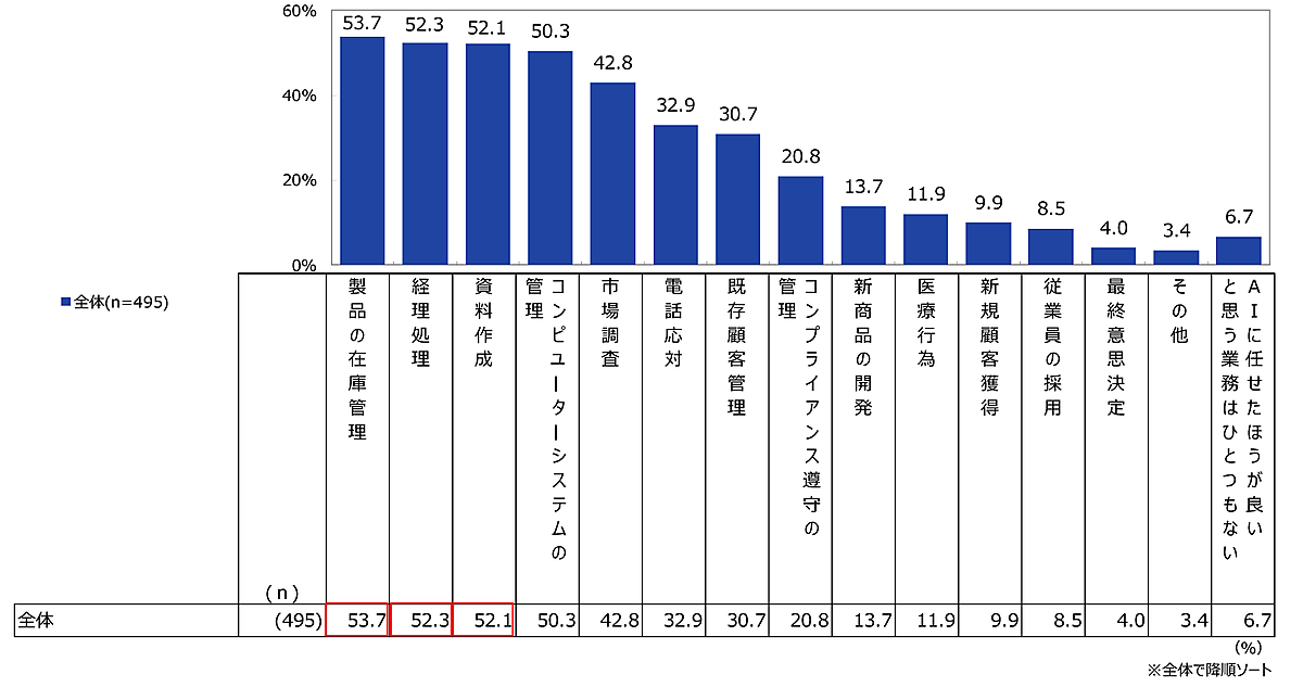 AIに任せたほうが良いと思う業務と、人間が対応したほうが良いと思う業務をそれぞれ聞いたところ、AIに任せたほうが良いと思う業務は「製品の在庫管理」53.7%がもっとも多く、「経理処理」52.3%、「資料作成」52.1%が僅差で並ぶ。