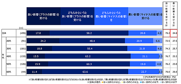 「AIの普及により自分の仕事がどのような影響を受けると思うか」を聞くと、「良い影響(プラスの影響)を受ける」は75.2%、「悪い影響(マイナスの影響)を受ける」は24.8%で、肯定的な人が7割を超えた。