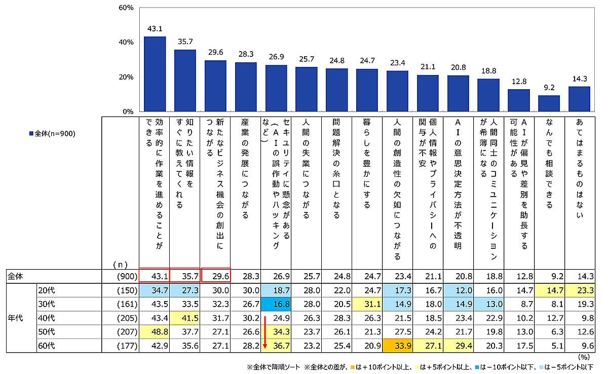 まず「AIのイメージ」について聞くと、「効率的に作業を進めることができる」43.1%が最多。以下「知りたい情報をすぐに教えてくれる」35.7%、「新たなビジネス機会の創出につながる」29.6%が続く。年代別でみると、「セキュリティに懸念がある(AIの誤作動やハッキングなど)」が40代以降増加する傾向がみられるなど、高年齢層ほどさまざまな懸念を示している。