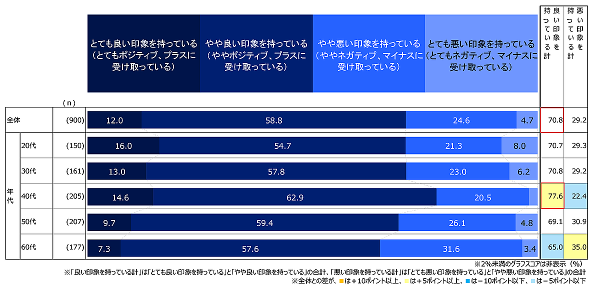 一方で、「AIが自身の生活に関与することに対して良い印象を持っている」という人は、「とても良い印象を持っている」12.0%+「やや良い印象を持っている」58.8%で合計70.8%と7割を超える。特に40代では77.6%に達している。