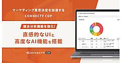 顧客データを一元管理するCONNECTY CDPは、顧客とのさまざまな接点を生み出し、収集した顧客データを集約・管理・分析してMA(マーケティング自動化)を使ったマーケティング施策の展開・精緻化まで担う。企業独自の1st Party Cookieの発行、Webサイト上のデータ、ECサイト、アプリで取得する顧客データや営業データ、POSレジデータなど企業内のさまざまなデータを統合して顧客の総合的な分析やカルテ作成ができる。