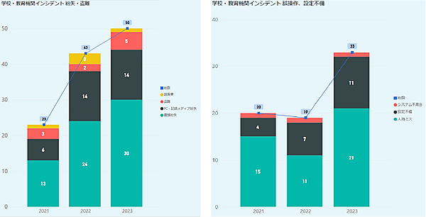 なお、いずれの年でもっとも多いのは「紛失・盗難」だった。細目では、児童個票、指導要録、修学旅行関連資料、健康診断書などの「書類紛失」がいずれの年でも最多だった。また「誤操作、設定不備」では、「人為ミス」によるインシデントの割合が多く、黒塗り(マスキング)の不備による個人情報の流出、個人情報の誤掲載、書類の誤送付が大半を占めた。