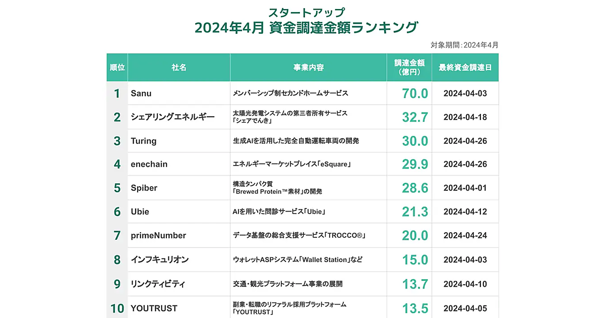3位は生成AIを活用した完全自動運転の実現を目指す「Turing」で、30億円を調達。4位はエネルギー取引マーケットプレイスを運営する「enechain(29億9,000万円)」と続いた。