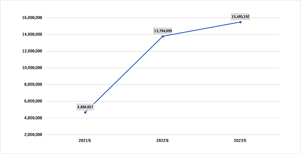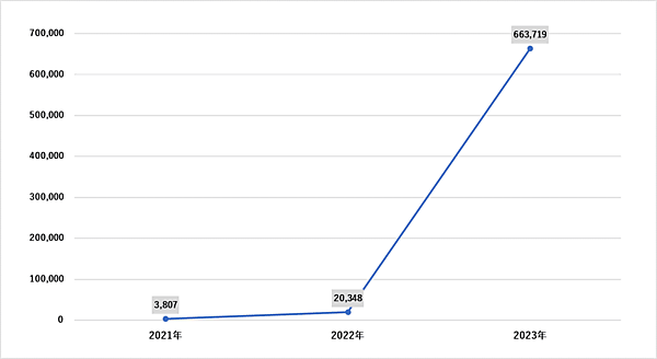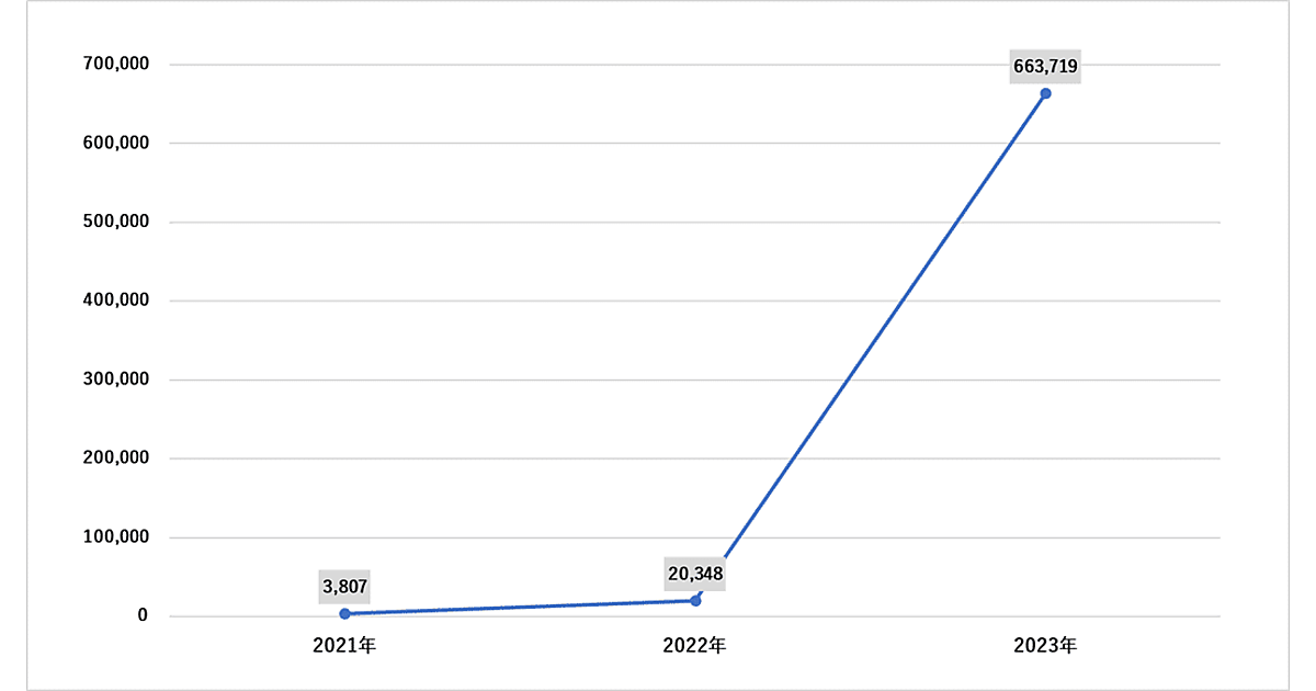 また2021年~2023年の3年間において「ChatGPT」「Canva」「Grammarly」のアカウントを売買するダークウェブ上の投稿数は、約268万6,000件に達していた。