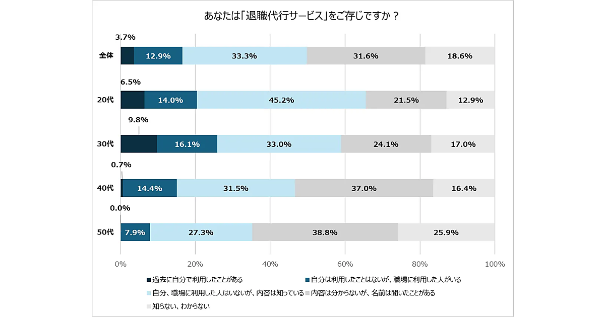 まず、退職代行サービスの利用・認知度を聞くと、「過去に自分が利用したことがある」は3.7%、「職場に利用した人がいる」は12.9%、「自分、職場に利用した人はいないが、内容は知っている」は33.3%となった。詳細に認知している人の合計は49.9%で、「名前は聞いたことがある」と合わせると、知名度は81.5%にのぼった。