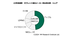 メーカー別の総出荷台数シェアをみると、1位は13年連続でアップルとなり、総出荷台数は1337.7万台(前年度比11.0%減)でシェア50.1%を占めた。2位はグーグル、3位はシャープ、4位はサムスン電子、5位は京セラ、6位はソニーと続き、上位6メーカーが全体の約9割を占める結果となった。