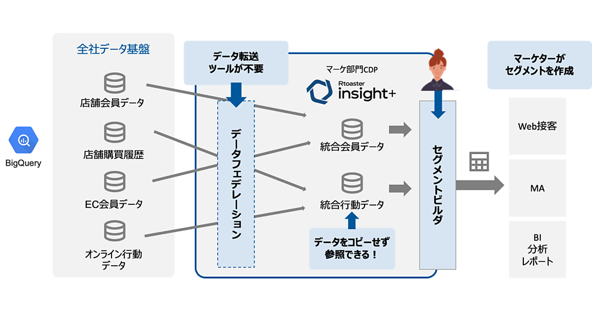 今回加えたのは、GCPのデータウエアハウス「Google BigQuery」で管理しているデータをRtoaster insight+にシームレスに統合する機能。マーケティング担当者はデータ連携に手間をかけることなく、Google BigQueryに集約した顧客データを直接Rtoaster insight+で利用可能になる。データ基盤を管理するIT部門とマーケティング部門の両方に利点がある。