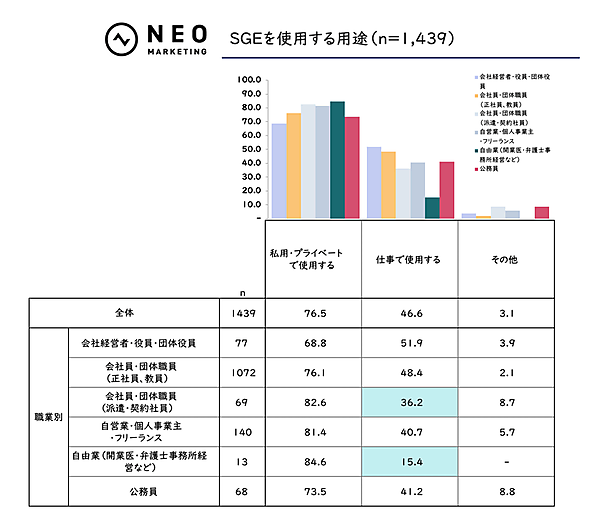 まず、スクリーニング設問にて「有職者でSGEを知っていてかつ使用している(ふだんからよく使用している+たまに使用している)」とした1,439人に使用用途を聞くと、76.5%が「私用・プライベートで使用」とした一方、「仕事で使用する」も46.6%に達していた。特に会社経営者層は51.9%と半数を超える。