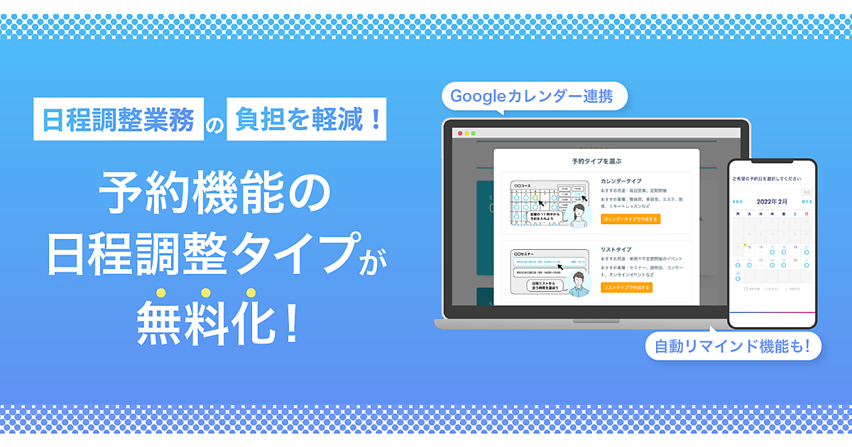 予約機能の日程調整タイプは、ページタイトルや予約可能な曜日・時間帯など必要事項を入力する直感的な操作で予約カレンダーを作成することができる。作成した予約カレンダーのURLをメールやSNS上でシェアして、すぐに予約を受け付けることが可能。公開した予約カレンダーは「Googleアカウント」と連携してカレンダーの空き時間だけを自動で表示でき、ダブルブッキングを防いで再調整の業務を削減する。