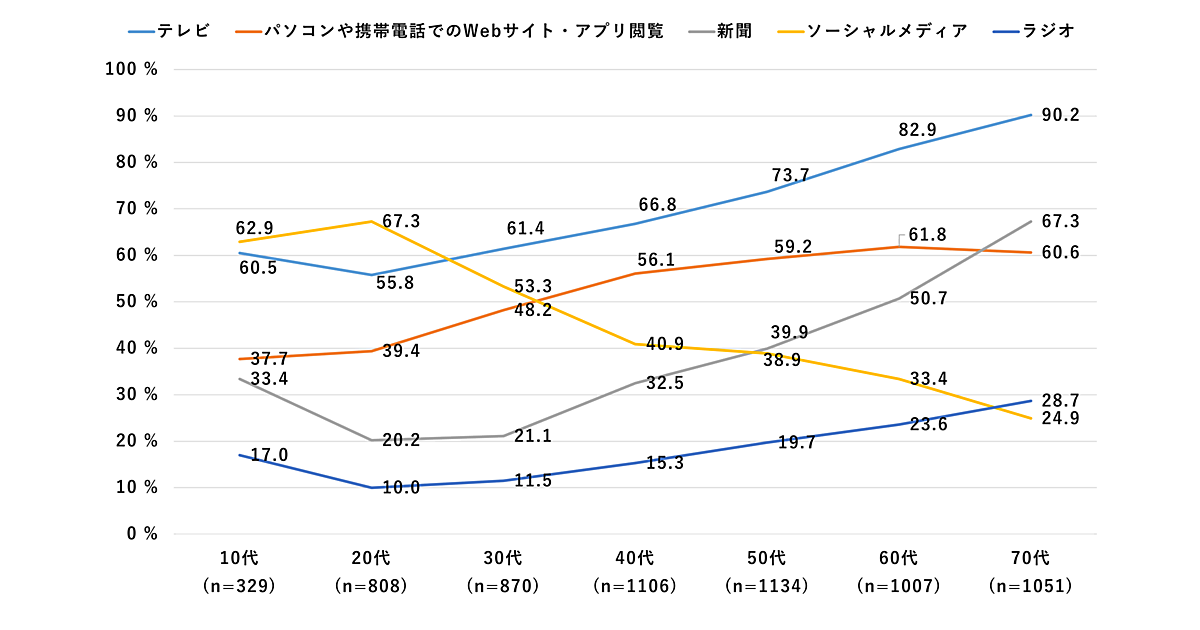 年代別でみると、30~70代では「テレビ」が最も高く、10~20代では「ソーシャルメディア」がトップとなった。特に70代では約9割が「テレビ」からニュース情報を得ており、「新聞」は7割弱、「WEB・アプリ」は約6割となった。