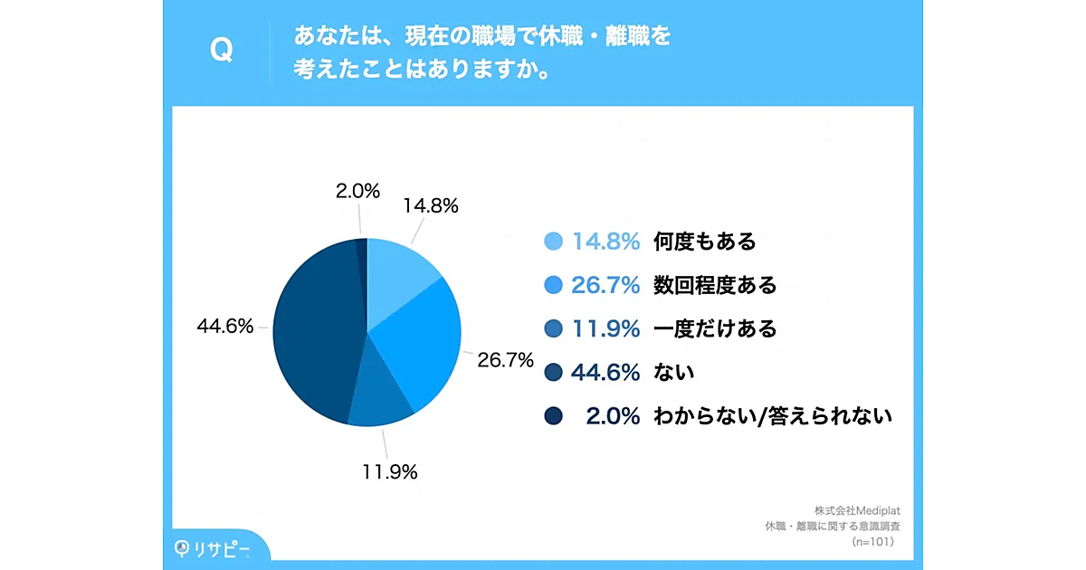 メドピアの連結子会社であるMediplatは、「休職・離職に関する意識調査」を実施した。大企業の中間管理職101名が回答している。