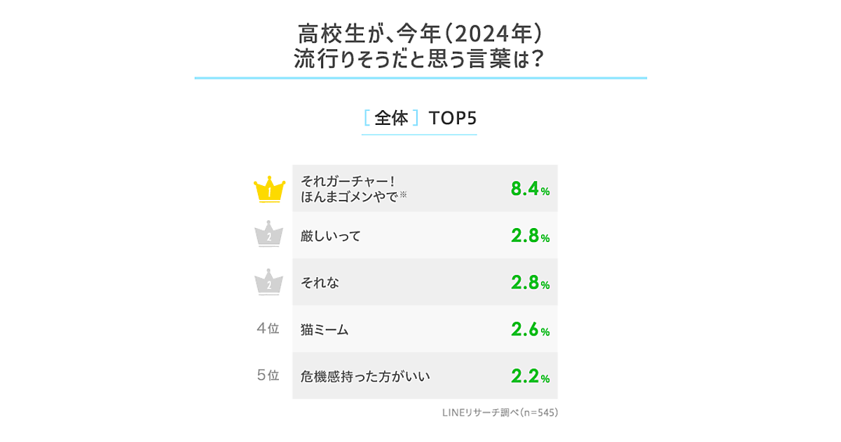 調査によると、高校生が選ぶ2024年に流行りそうな言葉1位は「それガーチャー! ほんまゴメンやで」が8.4%で圧倒的だった。「それガチ? ほんとごめん」を意味するフレーズで、菊池風磨が主演を務めたドラマ内でのセリフが元ネタと思われる。