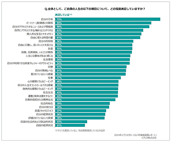 「人生で満足している項目」を聞くと、「自分の子ども」75%、「パートナー/配偶者との関係」69%、「自分がアクセスできるニュースおよび情報源」68%が上位。最下位は「自国の経済状況」21%だった。