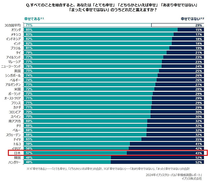 イプソスは、グローバル調査「幸福感調査レポート」を発表した。日本を含む世界30か国の23,269人が回答している。