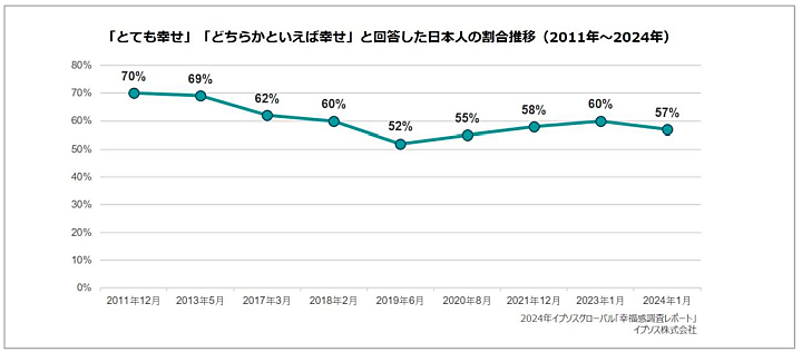 それによると「幸せである」と回答した日本人は57%で、調査対象国30か国中28番目の低さだった。2011年の調査と比較すると、13年間で13ポイント減少していた。