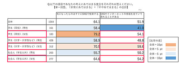 次に「気になったものはすぐにSNSで検索するか」を聞くと、「非常にあてはまる」「ややあてはまる」は、「学生(高校)/女性」79.2%、「学生(大学・大学院など)/女性」70.5%と、学生女性に高い傾向が見られる。「SNSやインターネットの情報を見ていて疲れることがある」も女性が高い。