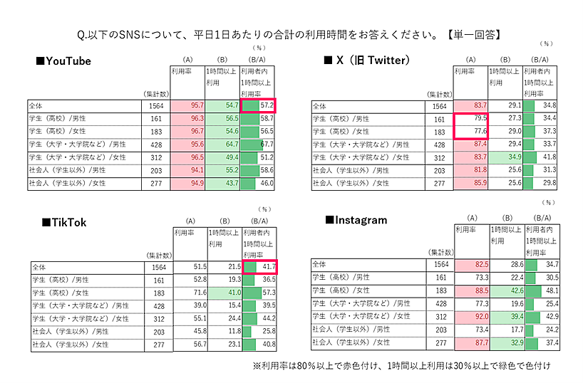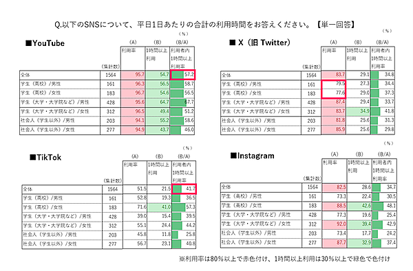 「平日における各SNSの利用時間」については、「YouTube」を1日1時間以上利用している人が57.2%と、他SNSと比べて高い。また「TikTok」利用率は51.5%とやや低いが、1時間以上利用している人は41.7%で、YouTubeに次いで長時間利用されている。