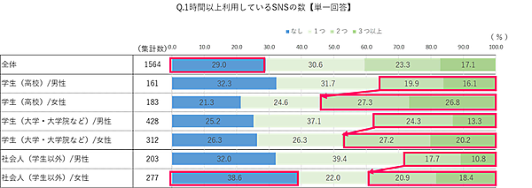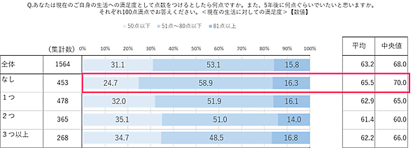一方で、「1時間以上利用しているSNS」について聞くと、「なし」の人は29.0%。さらに「生活満足度」についてあわせて聞くと、1時間以上利用しているSNSが「なし」の人が、平均点65.5点・中央値70.0点と、もっとも現在の生活への満足度が高いことが判明した。