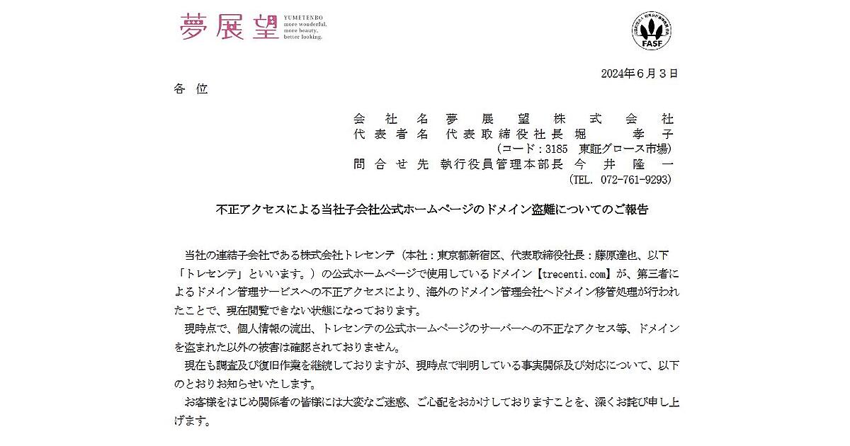 RIZAPグループで衣料品EC事業の夢展望は、連結子会社でジュエリー販売のトレセンテが公式ホームページで使用するドメイン「trecenti.com」が閲覧できなくなったと6月3日に発表した。第三者によるドメイン管理サービスへの不正アクセスで、海外のドメイン管理会社へドメインを移管処理された。ドメインを盗まれた以外の被害はなく、個人情報の流出やトレセンテの公式サーバーへの不正アクセスは確認されていない。