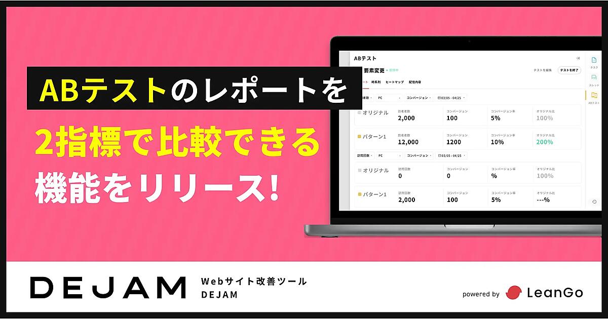 Webサイト改善ツールを展開するLeanGo(リーンゴー)は、マーケティングDX(デジタル変革)ツール「DEJAM(デジャム)」の機能をアップデートしたと6月5日に発表した。複数パターン用意するABテストのレポート画面に2指標で比較できるレポート基盤を追加した。2画面で分析作業ができるので指標別の比較が容易で分析業務の生産性が向上する。
