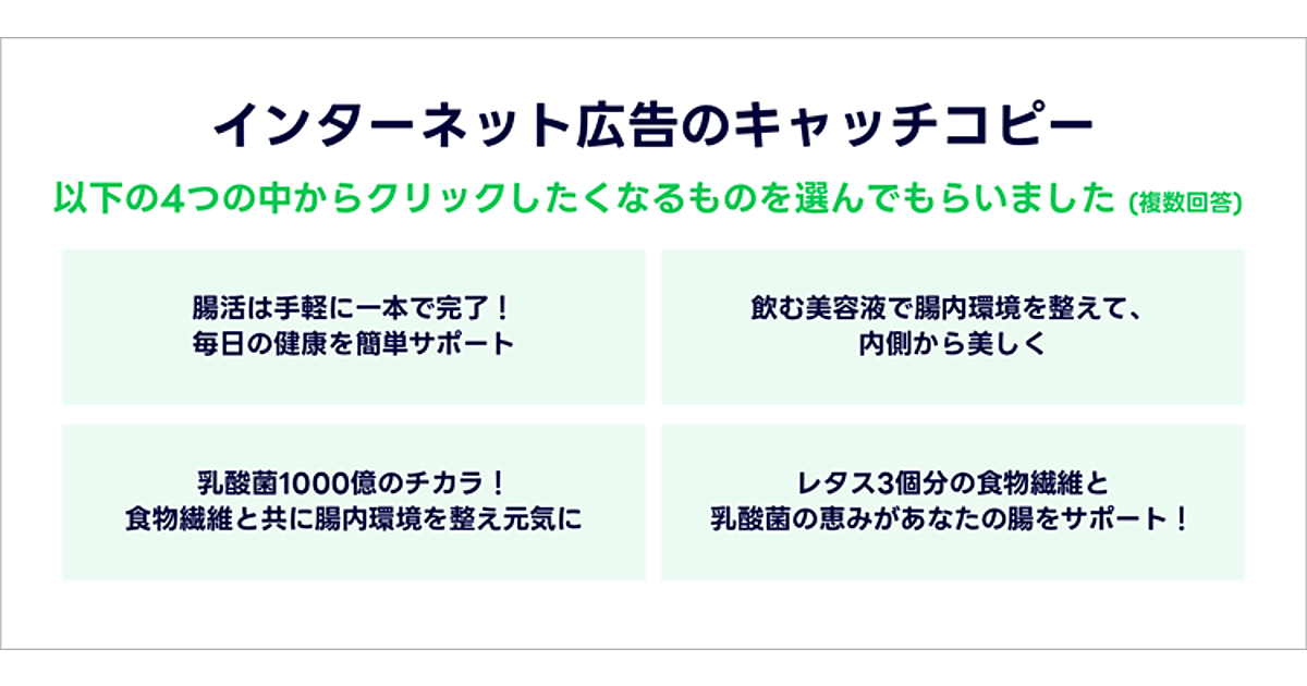 その結果、最も支持されたのは「乳酸菌1000億のチカラ! 食物繊維と共に腸内環境を整え元気に」で38.6%、ついで「飲む美容液で腸内環境を整えて、内側から美しく」が35.1%と続いた。