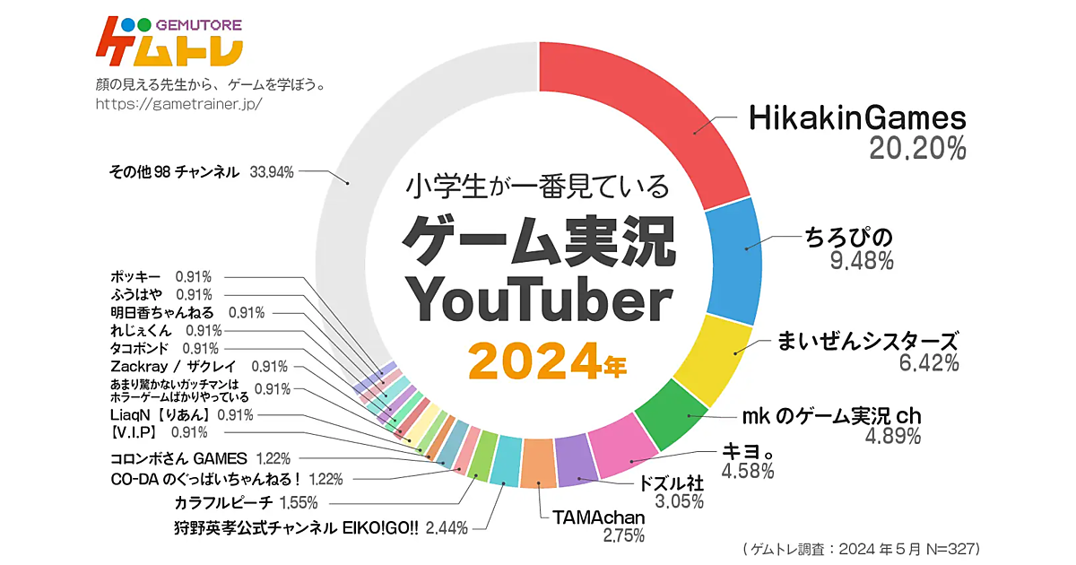 まず、小学生が今一番見ているゲーム実況YouTuberを聞くと、「HikakinGames(20.20%)」が5年連続のトップとなった。2位は「ちろぴの(9.48%)」、3位は「まいぜんシスターズ(6.42%)」と続き、その他(98チャンネル)に分類されるYouTuberを回答した人も多かった。