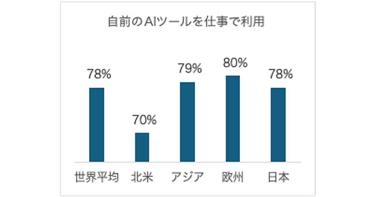 また、全世界でAIを使っている人の78%が、自前のAIツールを職場に持ち込んでいる(Bring Your Own AI:私的AI利用)ことがわかった。この傾向は全年齢層で共通で、特に中小企業の従業員において進んでいるようだった。日本はAIの利用率では後れを取っていたが、BYOAIしていると答えた人は78%で、世界平均と同程度だった。