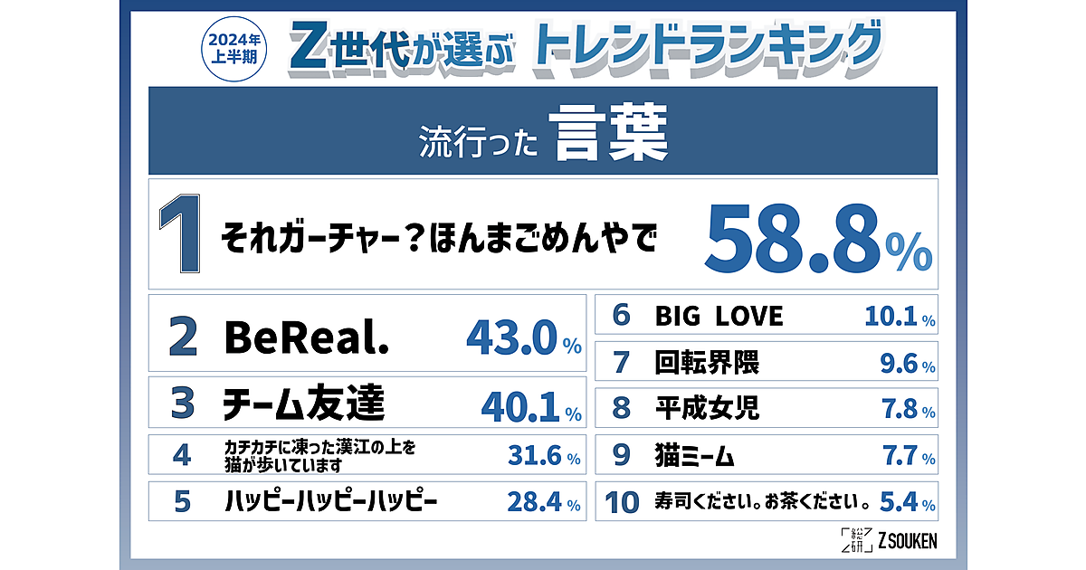 N.D.Promotiongaが運営するZ総研は、「2024年上半期トレンドランキング」を発表した。Z世代女子を中心にコミュニティ所属のメンバー626人(中学生110人、高校生245人、大学・専門学生159人、社会人112人)が回答している。あわせて編集部セレクトの「2024年下半期ネクストトレンド予想」も発表している。