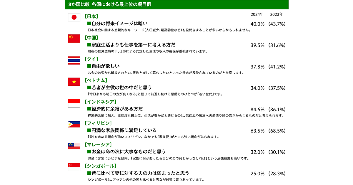 日本・中国・アセアンの8か国の中で、それぞれ最上位となった項目を見ていくと、日本は「自分の将来イメージは暗い」が40.0%にのぼり、圧倒的な1位だった。人口減少や超高齢化、物価高などの不安も多く、他国に比べて悲観的な人が多いようだ。
