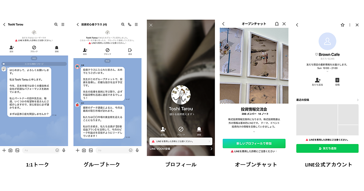 新たな対応は①特定画面に「LINEを悪用した詐欺にご注意ください」の注意喚起の表示(5月29日から順次)②通報時に選択する理由に「なりすまし」「詐欺」の項目を追加(5月28日から)③「LINE公式アカウント」のアカウント開設時の認証強化(6月以降)④印刷物やデジタルサイネージなどで活用できる注意喚起素材の作成・提供(同)となる。