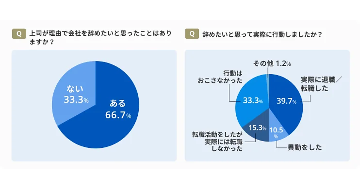上司に対して不満を持っている人に対し、上司が理由で会社を辞めたいと思ったことはあるかを聞くと、66.7%が「ある」と回答した。また、そうした場合に実際に行動したかを聞くと、39.7%が「実際に退職/転職した」、10.5%は「異動をした」と答えており、自ら環境を変えていることがわかった。