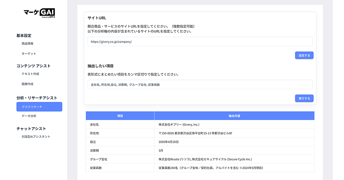生成AI(人工知能)の法人活用推進・マーケティングDX(デジタル変革)支援のギブリーは、マーケティング業務に特化した生成AIツール「マーケGAI」(マーケ・ジーエーアイ)の正式版の提供を始めたと6月19日に発表した。大幅なUI刷新と機能追加で企画・ライティング業務をより効率的に進められるだけでなく、デスクリサーチからSNS投稿画像生成、リーガルチェックまでマーケティングの幅広い領域をカバーして業務を効率化する。