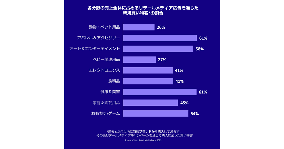 またアパレルとアクセサリー、アートとエンターテイメント、健康と美容の分野では、リテールメディアの広告をクリックして購入した5人のうち3人が当該ブランドの購入が初めてだった。