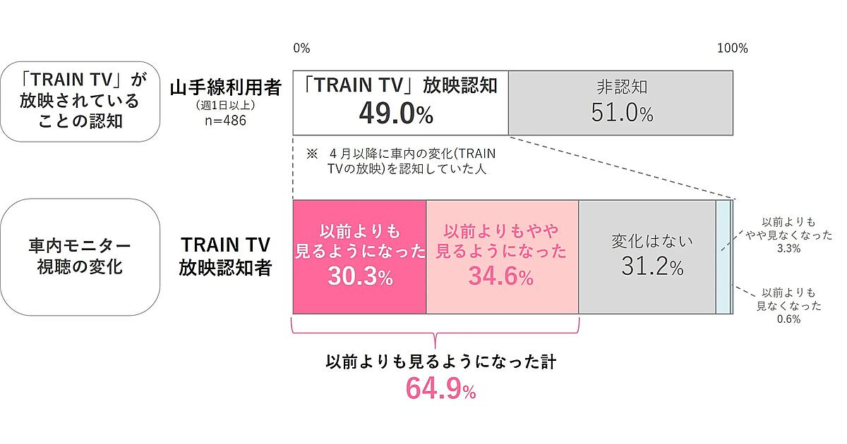 TRAIN TVは山手線、中央線、京浜東北線など10路線とゆりかもめの車内に搭載した約5万面のデジタルサイネージに映像コンテンツを配信する。従来のCMメーンから番組中心に編成を改めた。調査は放映路線を週1日以上利用する層に4月26~30日にインターネットで行った。サンプル数は1148。この中で山手線の利用者は49.0%がTRAIN TVの放映を既に認知していた。