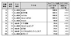 総合ランキング1位となったのは「楽天市場」で、Webブランド指数は前回から10.9ポイント増の118.0ポイント。WBIの6つの個別評価指標全てでスコアが上昇しており、特に「態度変容:製品・サービス」と「行動喚起」において高い評価を獲得した。第2位は「Yahoo! JAPAN」(4位→2位)、第3位は「Google」(1位→3位)だった。