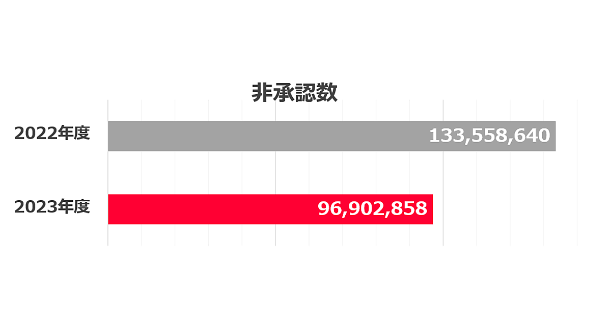 非承認の9690万2858件は広告単体の件数ではなく、広告掲載基準、広告入稿規定、広告販売ルールに抵触した広告のタイトル、説明文、画像、リンク先のウェブサイト、キーワードなど各非承認数を合わせた数。広告審査では、違反表現を繰り返したり大量の非承認広告を入稿したりする広告アカウント自体を停止。2023年度は、2022年度と同水準の7819件を非承認にした。