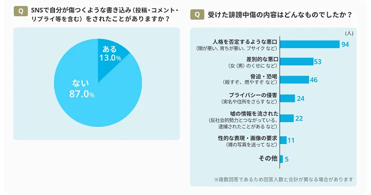 続いて、SNSで自分が傷つくような書き込みをされたことがあるかを聞くと、13.0%が「ある」と回答した。また、SNSで誹謗中傷を受けたことがある人に対し、具体的な内容を聞くと、「人格を否定するような悪口」が94人で最も多く、以下「差別的な悪口」「脅迫・恐喝」などが続いた。