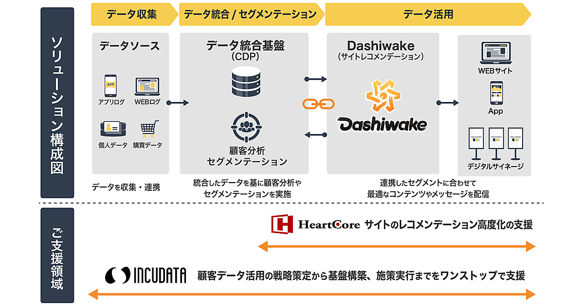 協業は、ハートコアの“おもてなし”プラットフォーム「Dashiwake」を利用。DashiwakeはCDPなどを利用し、顧客情報を基に個人の属性や興味・関心に応じて伝える内容を出し分けられる。インキュデータが持つ顧客データ活用のノウハウやCDPを生かしたデータ分析基盤構築・運用実績と組み合わせ、各顧客に合った情報発信を可能にする。